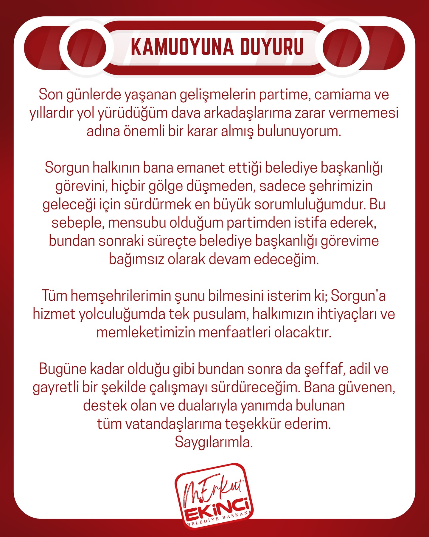 İstifa bilgisini sosyal medya aracılığıyla Sorgun halkına bildiren Ekinci, belediye başkanı görevini bağımsız olarak devam ettireceğini söyledi.